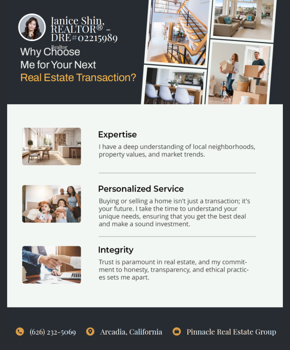 As a dedicated REALTOR® with Pinnacle Real Estate Group, serving Arcadia, City of Industry, Irvine, and the greater regions of Los Angeles, San Gabriel Valley, Orange, and Riverside counties, I am here to guide you through the ever-evolving real estate market. Whether you’re purchasing your first home, selling a property, or seeking an investment opportunity, my goal is to help you succeed with a personalized and results-driven approach.